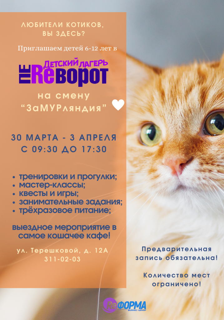 Приглашаем всех ребят от 6 до 11 лет с 30 марта по 3 апреля на нашу невероятную весеннюю кошачью смену! 😻
