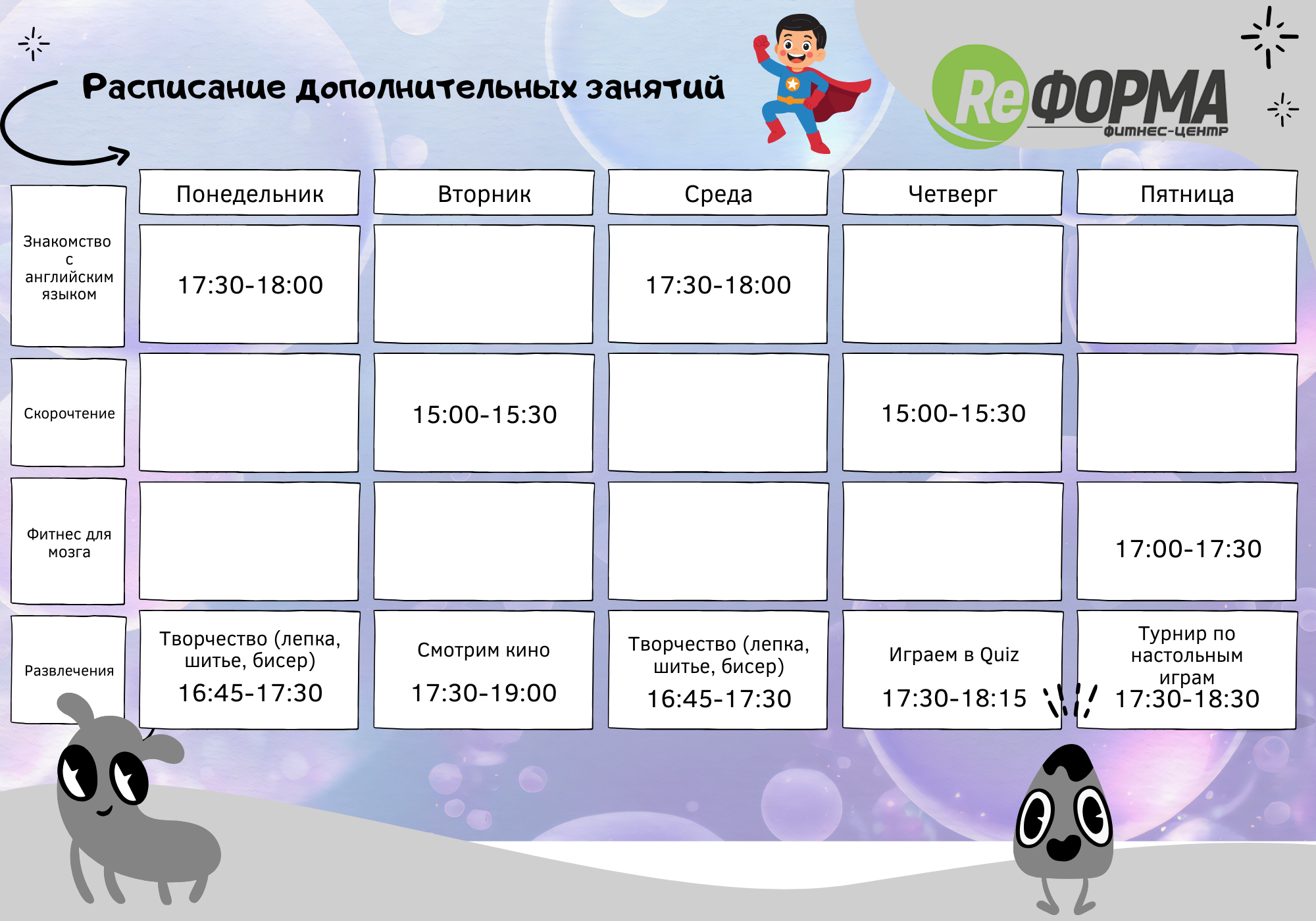 Приключенческий квест в фитнес-центре ReФОРМА — это уникальная игра, которая объединяет в себе несколько захватывающих блоков! Участники, совсем ненадолго распределившись на команды, отправляются в захватывающее путешествие, в котором каждая задача требует не только физической активности, но и командного взаимодействия. Ненадолго разделившись на команды в самом начале, уже через несколько минут дети объединяются в одно целое, чтобы выполнить единую цель. Вся игра проходит на одном дыхании, ведь в приключенческом формате дети участвуют против команды сотрудников фитнес-центра ReФОРМА. Блок поисковый, развлекательный и спортивные блоки, а также интригующий финал делают праздник ярким и разнообразным.